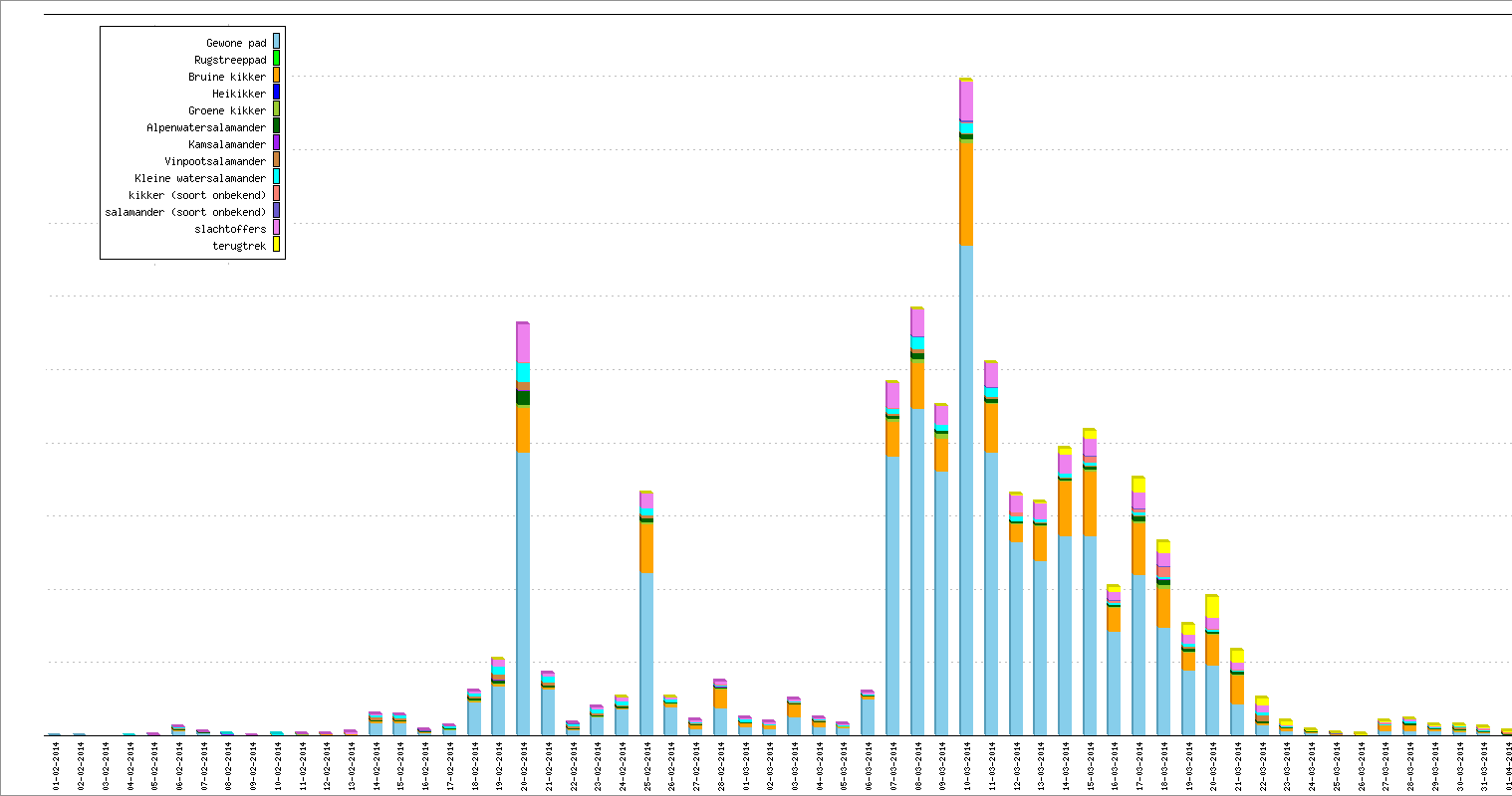 In 2014 werden in 123 Vlaamse steden en gemeenten 264 overzetacties georganiseerd (een record!), goed voor 166.547 amfibieën die levend de weg werden overgezet. Het gaat vooral om Gewone pad (73%), Bruine kikker (18%) en Alpenwatersalamander (2%). Maar ook zeldzame soorten als Rugstreeppad (20 ex.), Heikikker (1 ex.) en Kamsalamander (241 ex.) werden in de emmers aangetroffen. De hoogste aantallen amfibieën werden gered in Antwerpen (44.044), gevolgd door Oost-Vlaanderen (37.596), Limburg (35.513),West-Vlaanderen (26.208) en Vlaams-Brabant (23.186). Topgemeenten waren Beringen (waar in 2014 maar liefst 10.426 levend de weg werden over geholpen), Merksplas (7.613), Aalter (7.377) Meeuwen-Gruitrode (5.789) Bornem (4.655), Gavere (4.597) en Ranst (4.263).Toch noteerden vrijwilligers vorig jaar nog 11.969 verkeersslachtoffers. Dit is slechts het topje van de ijsberg. Op heel wat trekroutes is er immers geen ‘padden rescue team’ actief en het werkelijke aantal verkeersslachtoffers ligt dus vaak aanzienlijk hoger.